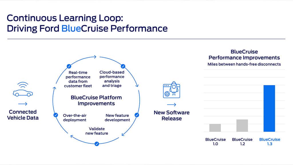 Your driving experience will be three times better with the new 1.3 update than with the original version of BlueCruise. And for those who started with BlueCruise 1.0, you'll see a whopping five times improvement!
