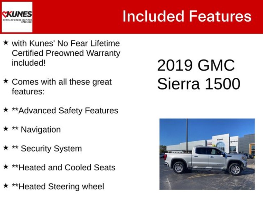 Quicksilver Metallic 2019 GMC Sierra 1500 SLT SLT with Kunes' No Fear Lifetime Certified Preowned Warranty included!, Comes with all these great features:, **Advanced Safety Features, ** Navigation, ** Security System, **Heated and Cooled Seats, **Heated Steering wheel, ** Steering Wheel Controls, ** Premium Wheels, ** Keyless Entry, ** Automatic Headlights, ** Bluetooth, ** Back up Camera, **Rear Park Assist, **SIRIUS XM, Remote Start, 10-Way Power Driver Seat Adjuster w/Lumbar, 10-Way Power Passenger Seat Adjuster w/Lumbar, 12-Volt Rear Auxiliary Power Outlet, 120-Volt Bed Mounted Power Outlet, 120-Volt Instrument Panel Power Outlet, 2 USB Ports, 20" x 9" Polished Aluminum Wheels, 220 Amp Alternator, 6-Speaker Audio System Feature, Alloy wheels, Apple CarPlay/Android Auto, Auto-dimming door mirrors, Automatic temperature control, Auxiliary External Transmission Oil Cooler, Compass, Deep-Tinted Glass, Delay-off headlights, Driver door bin, Driver Memory, Driver vanity mirror, Electrical Lock Control Steering Column, Enhanced Cooling Radiator, Front 40/20/40 Split-Bench Seat, Front Bucket Seats, Front Center Armrest w/Storage, Front Frame-Mounted Black Recovery Hooks, Front reading lights, Front wheel independent suspension, GMC 4G LTE, Heated 2nd Row Outboard Seats, Heated Driver & Front Passenger Seating, Heated front seats, Heavier Duty Rear Springs, Heavy Duty Suspension, Illuminated entry, Increased RGAWR, Keyless Open & Start, LED Cargo Area Lighting, Manual Tilt-Wheel & Telescoping Steering Column, Occupant sensing airbag, OnStar & GMC Connected Services Capable, Outside temperature display, Overhead console, Passenger door bin, Perimeter Lighting, Power Front Passenger Windows w/Express Up/Down, Power passenger seat, Power Rear Windows w/Express Down, Power Sliding Rear Window w/Rear Defogger, Premium audio system: GMC Infotainment System, Premium Bose 7-Speaker Sound System, Radio data system, Radio: Premium GMC Infotainment Sys w/Multi-Touch, Radio: Premium GMC Infotainment Sys w/Navigation, Rear Dual USB Charging-Only Ports, Rear reading lights, Rear seat center armrest, Rear Wheelhouse Liners, Rear window defroster, SiriusXM Radio, Speed-sensing steering, Split folding rear seat, Steering Wheel Audio Controls, Steering wheel mounted audio controls, Tachometer, Telescoping steering wheel, Theft Deterrent System (Unauthorized Entry), Tilt steering wheel, Trailer Tire Pressure Monitor System, Trip computer, Ultrasonic Front & Rear Park Assist, Variably intermittent wipers, Voltmeter, Wheels: 18" x 8.5" 6-Spoke Machined Aluminum.