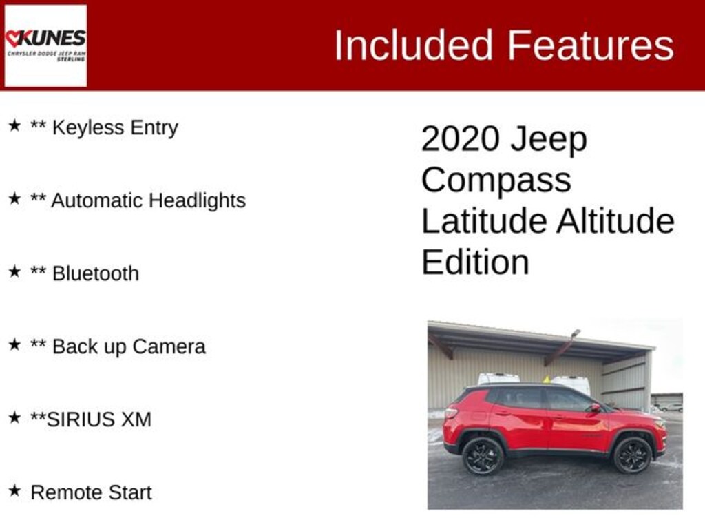 Discover the perfect blend of style, capability, and convenience with this stunning 2020 Jeep Compass Altitude. This exceptional SUV boasts a striking Red exterior that commands attention, complemented by a sleek and sophisticated design that exudes confidence on the road.