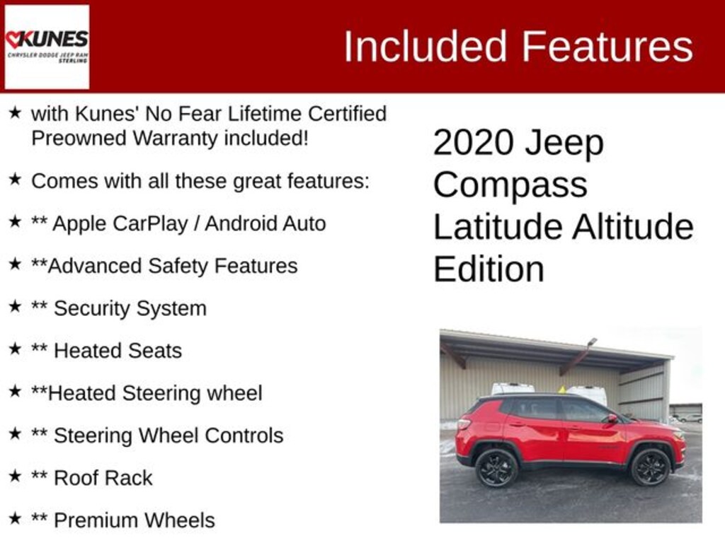 Backed by Kunes' No Fear Lifetime Certified Preowned Warranty, this Compass Altitude offers unparalleled peace of mind. You can drive with confidence, knowing that your investment is protected by an industry-leading warranty that covers your vehicle for as long as you own it.