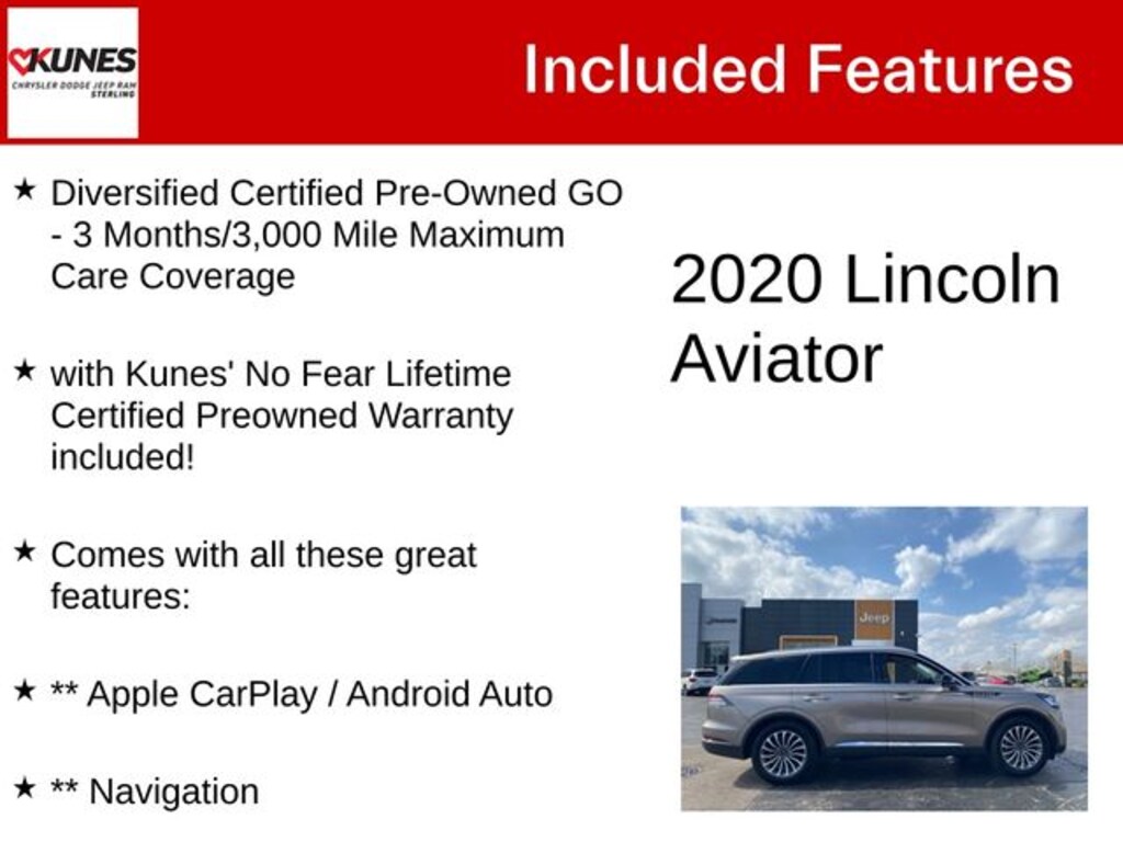Mocha Metallic 2020 Lincoln Aviator Reserve Reserve Diversified Certified Pre-Owned GO - 3 Months/3,000 Mile Maximum Care Coverage, with Kunes' No Fear Lifetime Certified Preowned Warranty included!, Comes with all these great features:, ** Apple CarPlay / Android Auto, ** Navigation, ** Security System, **Panoramic Sunroof, **Heated and Cooled Seats, **Heated Steering wheel, **Heated Rear Seating, 3rd Row Seating, ** Steering Wheel Controls, ** Roof Rack, ** Keyless Entry, ** Automatic Headlights, ** Bluetooth, ** Back up Camera, **Rear Park Assist, **SIRIUS XM, Remote Start, 14 Speakers, 3.58 Axle Ratio, 3rd row seats: split-bench, 4-Wheel Disc Brakes, ABS brakes, Active Park Assist Plus, Adaptive Cruise Control w/Traffic Jam Assist, Adaptive suspension, Air Conditioning, Alloy wheels, AM/FM radio: SiriusXM, Audio memory, Auto High-beam Headlights, Auto-dimming door mirrors, Auto-dimming Rear-View mirror, Brake assist, Bumpers: body-color, Compass, Delay-off headlights, Driver door bin, Driver vanity mirror, Dual front impact airbags, Dual front side impact airbags, Electronic Stability Control, Elements Package Plus, Equipment Group 201A, Evasive Steering Assist, Four wheel independent suspension, Front anti-roll bar, Front Bucket Seats, Front Center Armrest, Front dual zone A/C, Front fog lights, Front reading lights, Fully automatic headlights, Garage door transmitter, Heated door mirrors, Heated front seats, Heated Steering Wheel, Heated VisioBlade Wipers, Heated/Ventilated 2nd Row Outboard Seats, Heated/Ventilated Driver & Passenger Seats, HVAC memory, Knee airbag, Lincoln Co-Pilot360 Plus, Low tire pressure warning, Memory seat, Navigation System, Occupant sensing airbag, Overhead airbag, Overhead console, Panic alarm, Panoramic Vista Roof w/Power Shade, Passenger door bin, Passenger vanity mirror, Power door mirrors, Power driver seat, Power Liftgate, Power passenger seat, Power steering, Power windows, Premium Leather Enhanced Micro-Perforated Seats, Radio data system, Radio: Revel AM/FM Audio System w/14 Speakers, Rear air conditioning, Rear anti-roll bar, Rear audio controls, Rear dual zone A/C, Rear reading lights, Rear window defroster, Rear window wiper, Remote keyless entry, Reverse Brake Assist, Speed control, Speed-Sensitive Wipers, Split folding rear seat, Spoiler, Steering wheel memory, Steering wheel mounted A/C controls, Steering wheel mounted audio controls, Tachometer, Telescoping steering wheel, Tilt steering wheel, Traction control, Trip computer, Turn signal indicator mirrors, Variably intermittent wipers, Ventilated front seats, Wheels: 20" Bright Machined Aluminum.