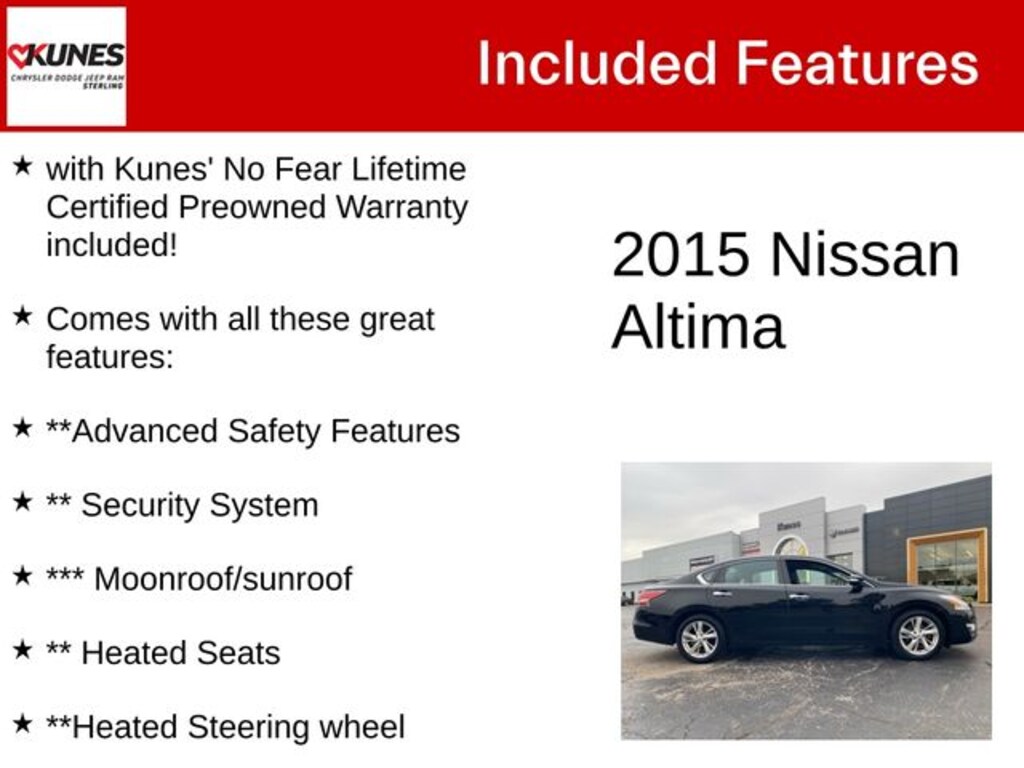 Super Black Clearcoat 2015 Nissan Altima 2.5 SL 2.5 SL with Kunes' No Fear Lifetime Certified Preowned Warranty included!, Comes with all these great features:, **Advanced Safety Features, ** Security System, *** Moonroof/sunroof, ** Heated Seats, **Heated Steering wheel, ** Steering Wheel Controls, ** Premium Wheels, ** Keyless Entry, ** Automatic Headlights, ** Bluetooth, ** Back up Camera, **SIRIUS XM, Remote Start. Recent Arrival!