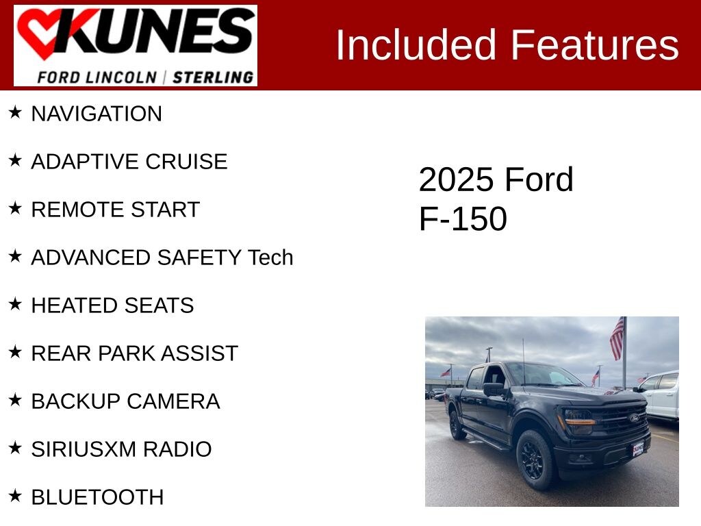 Agate Black Metallic 2025 Ford F-150 XLT NAVIGATION, ADAPTIVE CRUISE, REMOTE START, ADVANCED SAFETY Tech, HEATED SEATS, REAR PARK ASSIST, BACKUP CAMERA, SIRIUSXM RADIO, BLUETOOTH, F-150 XLT, 4D SuperCrew, 5.0L V8, 10-Speed Automatic, 4WD, Agate Black Metallic, Black Cloth, Equipment Group 302A Mid.