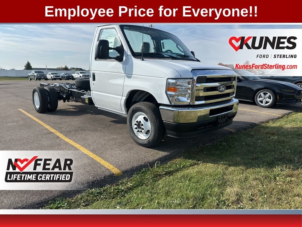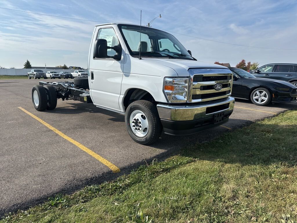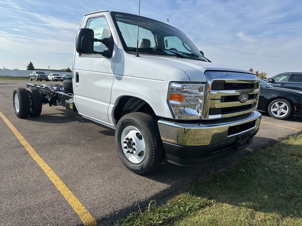 Oxford White 2026 Ford E-450SD DRW 16" x 6" White Painted Steel Wheels, 2 Speakers, 4-Speaker Upgrade Package, 4-Wheel Disc Brakes, 4.56 Axle Ratio, ABS brakes, Air Conditioning, AM/FM radio, Automatic Emergency Braking (AEB) Delete, Chrome Grille, Cruise Control, Day/Night Interior Rear-View Mirror, Driver door bin, Driver's Seat Mounted Armrest, Dual front impact airbags, Dual High Back Buckets, Dual rear wheels, Electronic Stability Control, Embedded Modem Delete, Frame Pucks (Isolators), Front anti-roll bar, Front Black Vinyl Floor Covering, Front Bucket Seats, Front Chrome Bumper, Front wheel independent suspension, Fully automatic headlights, GVWR: 14,500 lb Payload Package, High Series Exterior Upgrade Package, High-Series Door-Trim Panels, Instrument Panel - Basic Message Center, Interior Upgrade Package, Low tire pressure warning, Passenger door bin, Passenger seat mounted armrest, Power steering, Radio: AM/FM Stereo w/Clock Display & 2 Speakers, Rear anti-roll bar, Telescoping steering wheel, Tilt steering wheel, Traction control, Variably intermittent wipers, Vinyl Bucket Seats, Voltmeter.