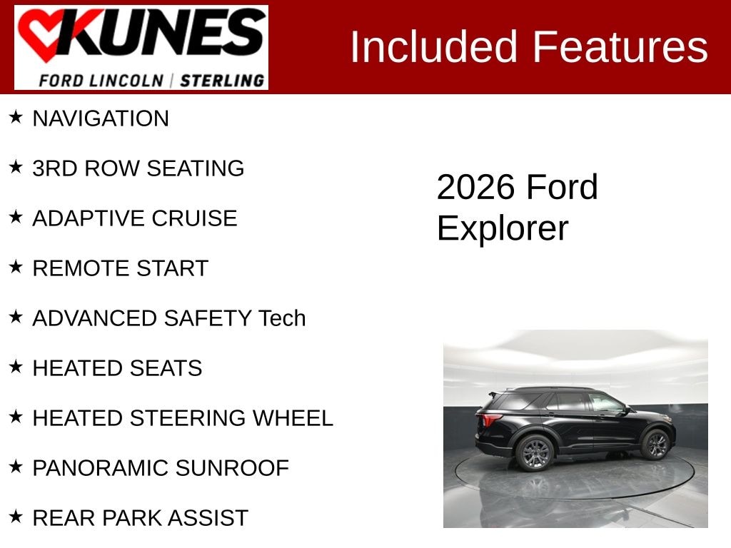 The 2026 Explorer can carry all the passengers and cargo you need in style and comfort. Also included with every new vehicle: LIFETIME "NO FEAR" WARRANTY and AT HOME COURTESY DELIVERY! Call us for full details! We pride ourselves on honesty and integrity, but please note that mistakes or misprints due to human error are possible. Find out why our dealerships have won DealerRater.com DEALER OF THE YEAR a whopping 10 TIMES! Call, email, or live chat with one of our friendly sales professionals now to schedule your test drive! Prices shown do not include taxes, license, and title fees and $377.63 documentary service fee, and $399 Security Fee. Price includes: $3500 - Retail Customer Cash. Exp. 04/30/2026 $500 - Retail Bonus Cash. Exp. 04/30/2026 Price Includes: $2000 - Trade in assistance. Exp. 12/31/2026 Trade In Allowance. Trade must be 2020 or newer and have less than 65k miles