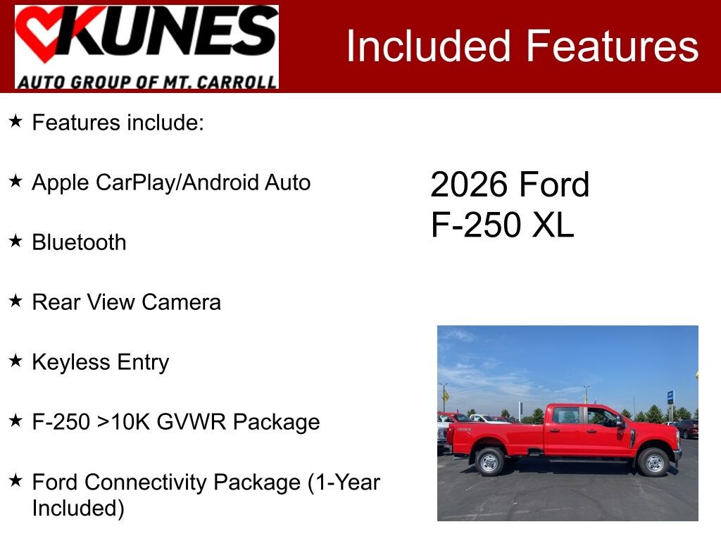 Apple CarPlay/Android Auto, Bluetooth, Rear View Camera, Keyless Entry, F-250 SuperDuty XL, 4D Crew Cab, 6.8L V8, 10-Speed Automatic, 4WD, Pq/As, Medium Dark Slate Vinyl, F-250 >10K GVWR Package, Ford Connectivity Package (1-Year Included), 3.73 Axle Ratio, 4-Wheel Disc Brakes, ABS brakes, Air Conditioning, BLIS w/Cross-Traffic Alert, Brake assist, Compass, Delay-off headlights, Dual front impact airbags, Dual front side impact airbags, Electronic Stability Control, Emergency communication system: SYNC 4 911 Assist, Front anti-roll bar, Front reading lights, Fully automatic headlights, Heated door mirrors, Illuminated entry, Low tire pressure warning, Outside temperature display, Overhead airbag, Overhead console, Panic alarm, Passenger vanity mirror, Power door mirrors, Power steering, Power windows, Privacy Glass, Rear Parking Sensors, Rear reading lights, Rear step bumper, Remote keyless entry, Security system, Speed control, Split folding rear seat, Steering wheel mounted audio controls, Tachometer, Telescoping steering wheel, Tilt steering wheel, Traction control, Trip computer, Turn signal indicator mirrors, Variably intermittent wipers, F-250 SuperDuty XL, 4D Crew Cab, 6.8L V8, 10-Speed Automatic, 4WD, Pq/As, Medium Dark Slate Vinyl, F-250 >10K GVWR Package, Ford Connectivity Package (1-Year Included). 2026 Ford F-250SD XL Pq/As 6.8L V8
