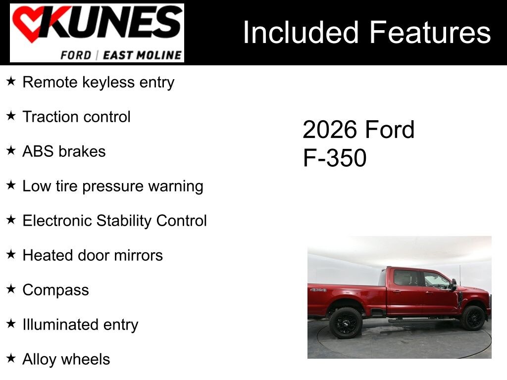 Ruby Red 2026 Ford F-350SD XLT 4WD 10-Speed Automatic 7.3L 8-Cylinder PFI 4WD, ABS brakes, Alloy wheels, Compass, Electronic Stability Control, Heated door mirrors, Illuminated entry, Low tire pressure warning, Remote keyless entry, Traction control.