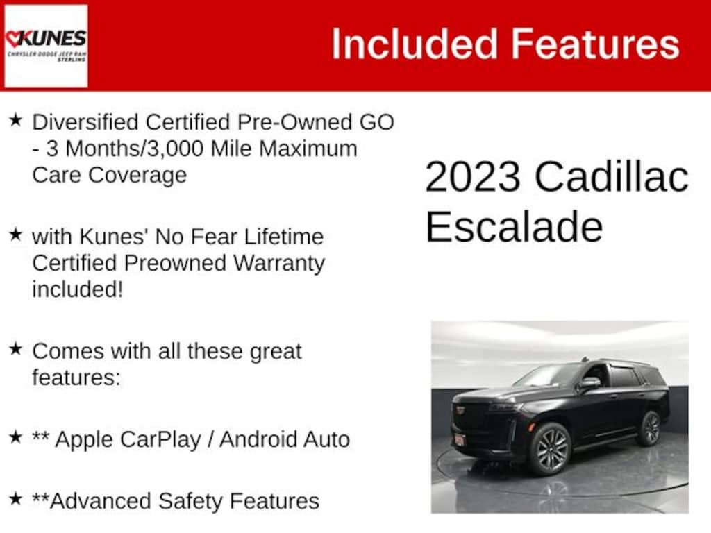 Black Raven 2023 Cadillac Escalade Sport Sport Diversified Certified Pre-Owned GO - 3 Months/3,000 Mile Maximum Care Coverage, with Kunes' No Fear Lifetime Certified Preowned Warranty included!, Comes with all these great features:, ** Apple CarPlay / Android Auto, **Advanced Safety Features, **Adaptive Cruise Control, ** Navigation, ** Security System, *** Moonroof/sunroof, **Panoramic Sunroof, **Heated and Cooled Seats, **Heated Steering wheel, **Heated Rear Seating, 2nd Row Captain Chairs, **Rear Entertainment System, 3rd Row Seating, ** Steering Wheel Controls, ** Roof Rack, ** Premium Wheels, ** Keyless Entry, ** Automatic Headlights, ** Bluetooth, ** Back up Camera, **Rear Park Assist, **SIRIUS XM, Remote Start, 16.9" Diagonal OLED Infotainment Screen, 19 Speakers, 2-Presets Memory For Driver Seat Adjuster, 4-Way Power Driver Lumbar Seat Adjuster, 4-Way Power Front Passenger Lumbar Seat Adjuster, 4-Wheel Disc Brakes, 8-Way Power Driver Seat Adjuster, 8-Way Power Front Passenger Seat Adjuster, ABS brakes, Active Cruise Control, Adaptive Cruise Control, Adaptive suspension, AKG Studio 19-Speaker Audio System, AM/FM radio: SiriusXM with 360L, Apple CarPlay/Android Auto, Audio memory, Automatic Seat Belt Tightening, Automatic temperature control, Body-Color Door Handles, Door Lock & Latch Shields, Dual front impact airbags, Dual front side impact airbags, Electronic Limited-Slip Differential, Emergency communication system: OnStar and Cadillac connected services capable, Enhanced Automatic Emergency Braking, Enhanced Automatic Parking Assist, Front anti-roll bar, Front dual zone A/C, Glass Breakage Sensor, Heads-Up Display, Heated & Ventilated Driver & Front Passenger Seats, Heated Driver & Front Passenger Seats, Heated front seats, Heated steering wheel, Hitch Guidance w/Hitch View, Integrated Trailer Brake Controller, Leather Seating Surfaces w/Precision Perf Inserts, Low tire pressure warning, Magnetic Ride Control Suspension, Memory seat, Navigation System, Occupant sensing airbag, Overhead airbag, Power driver seat, Power Liftgate, Power Panoramic Tilt-Sliding Sunroof, Power steering, Preferred Equipment Group 1SC, Rear anti-roll bar, Rear Camera Mirror, Rear Camera Mirror Washer, Rear Cross Traffic Alert, Rear Seat Entertainment System, Reconfigurable Full-Color Head-Up Display, Reverse Automatic Braking, Running Board Assist Steps, Smart Trailer Integration Indicator, Speed control, Split folding rear seat, Steering wheel mounted audio controls, Super Cruise, Teen Driver, Theft-Deterrent Alarm System, Trailer Side Blind Zone Alert, Trip computer, Vehicle Inclination Sensor, Vehicle Interior Movement Sensor, Voltmeter, Wheels: 22" 12-Spoke Polished Alloy, Wireless Apple CarPlay/Wireless Android Auto.