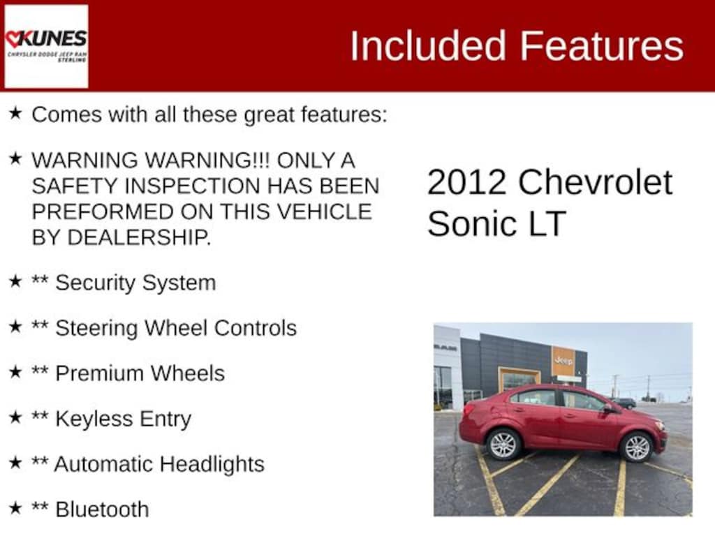 Crystal Red Tintcoat 2012 Chevrolet Sonic 2LT 2LT Comes with all these great features:, WARNING WARNING!!! ONLY A SAFETY INSPECTION HAS BEEN PREFORMED ON THIS VEHICLE BY DEALERSHIP., ** Security System, ** Steering Wheel Controls, ** Premium Wheels, ** Keyless Entry, ** Automatic Headlights, ** Bluetooth, **SIRIUS XM, Remote Start.