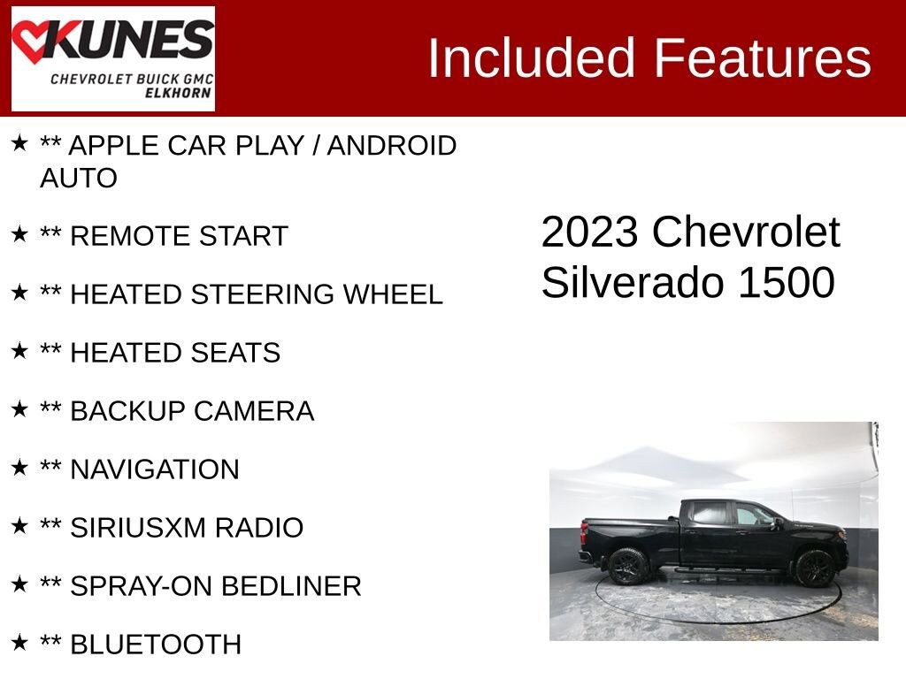 ** APPLE CAR PLAY / ANDROID AUTO, ** REMOTE START, ** HEATED STEERING WHEEL, ** HEATED SEATS, ** BACKUP CAMERA, ** NAVIGATION, ** SIRIUSXM RADIO, ** SPRAY-ON BEDLINER, ** BLUETOOTH, ** 4G LTE WI-FI, NO ACCIDENTS, LOCAL TRADE, 10-Speed Automatic, 4WD, Jet Black Cloth, 10-Way Power Driver Seat w/Lumbar, 12.3 Multicolor Reconfigurable Digital Display, 120-Volt Bed Mounted Power Outlet, 120-Volt Instrument Panel Power Outlet, 220 Amp Alternator, 40/20/40 Front Split-Bench Seat, All-Star Edition, Apple CarPlay/Android Auto, Auto High-beam Headlights, Bluetooth® For Phone, Brake assist, Chevrolet Connected Access Capable, Color-Keyed Carpeting Floor Covering, Compass, Delay-off headlights, Driver door bin, Driver vanity mirror, Electrical Steering Column Lock, Electronic Stability Control, EZ Lift Power Lock & Release Tailgate, Front anti-roll bar, Front Center Armrest w/Storage, Front Frame-Mounted Black Recovery Hooks, Front LED Fog Lamps, Front reading lights, Front Rubberized Vinyl Floor Mats, Fully automatic headlights, HD Rear Vision Camera, Heated Driver & Front Outboard Passenger Seats, Heated steering wheel, High Gloss Black Mirror Caps, Hitch Guidance, Illuminated entry, Keyless Open & Start, Low tire pressure warning, OnStar & Chevrolet Connected Services Capable, Outside temperature display, Overhead console, Passenger door bin, Passenger vanity mirror, Power Front Windows w/Driver Express Up/Down, Power Front Windows w/Passenger Express Down, Power Rear Windows w/Express Down, Power windows, Premium audio system: Chevrolet Infotainment 3 Premium, Rear 60/40 Folding Bench Seat (Folds Up), Rear reading lights, Rear Rubberized-Vinyl Floor Mats, Rear window defroster, Remote Vehicle Starter System, Speed-sensing steering, Split folding rear seat, Standard Tailgate, Steering Wheel Audio Controls, Steering wheel mounted audio controls, Tachometer, Telescoping steering wheel, Theft Deterrent System (Unauthorized Entry), Tilt steering wheel, Variably intermittent wipers, Voltmeter, Wheels: 18 x 8.5 Bright Silver Painted Aluminum, Wireless Phone Projection.Certified. Certification Program Details:** NO FEAR LIFETIME CERTIFIED PREOWNED **Over $2,895 of value at no cost!*LIFETIME WARRANTY!*3 Day Exchange Policy!*Complimentary powertrain warranty with ability to upgrade to fully comprehensive coverage and/or extend up to 125,000 miles!*125+ Point Inspection by our factory trained ASE Certified technicians and reconditioned to the highest standards.*Complimentary AutoCheck History Report*Complimentary AutoCheck Buyback Protection*Financing for Everyone - Guaranteed credit approval regardless of credit history!*Over 30 lenders who compete to get you the best financing terms*No payments for up to 90 days!*Weekly, Bi-Weekly, and Monthly Payment Options for all buyers!*First Free Oil Change!*Trade anytime policy - cars, trucks, boats, RVs, motorcycles - as long as we donât have to feed it, you can trade it!2023 Chevrolet Silverado 1500 RST 3.0L I6 10-Speed Automatic 4WD Clean CARFAX. 22/27 City/Highway MPGFind out why our dealerships have won DealerRater.com DEALER OF THE YEAR a whopping 10 TIMES! Call, email, or live chat with one of our friendly sales professionals now to schedule your test drive! Ask about some of our other Chevrolet, GMC, Buick, Ford, Chrysler, Dodge, Jeep, Ram, Tesla, Kia, Hyundai, INFINITI, BMW, Mercedes, Toyota, Lexus, Nissan, Volkswagen, Hummer, Lincoln, Mazda, Mitsubishi, Honda, Acura, and other vehicles that may have navigation, sunroof, adaptive cruise control, leather, cooled seats, blind spot monitor, lane keep assist, panoramic moonroof, tow hitch, Bose audio, Harman Kardon, Sony, remote start, AWD, all wheel drive, 4x4, wireless charging, sirius XM, heated seats, heated steering wheel, V8, diesel, chrome, bed-liner, luggage rack, sensing, power folding mirrors, 5th wheel, gooseneck, autopilot, self-driving, EV, r