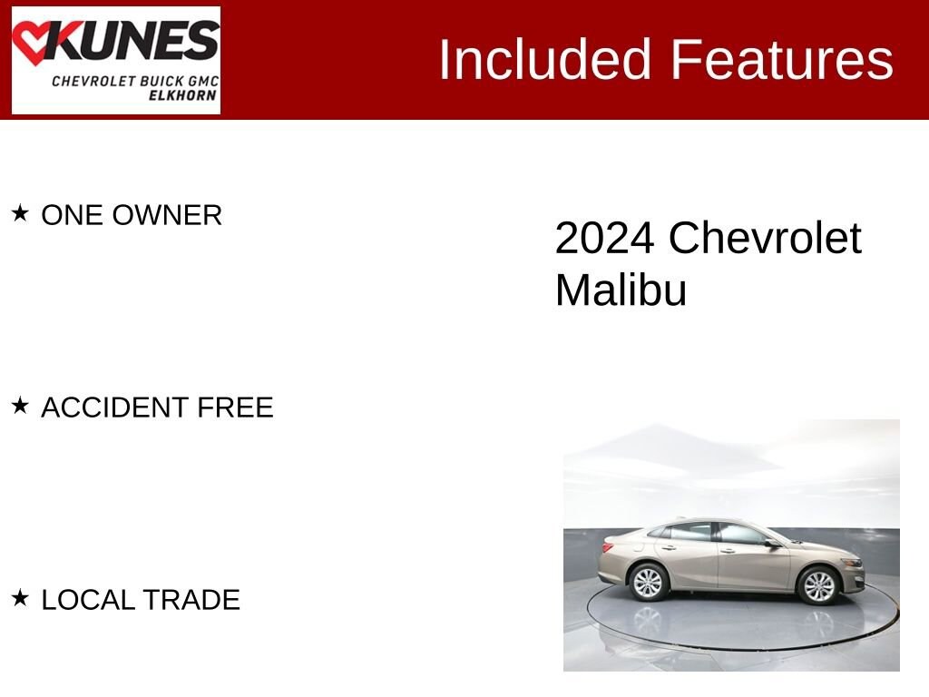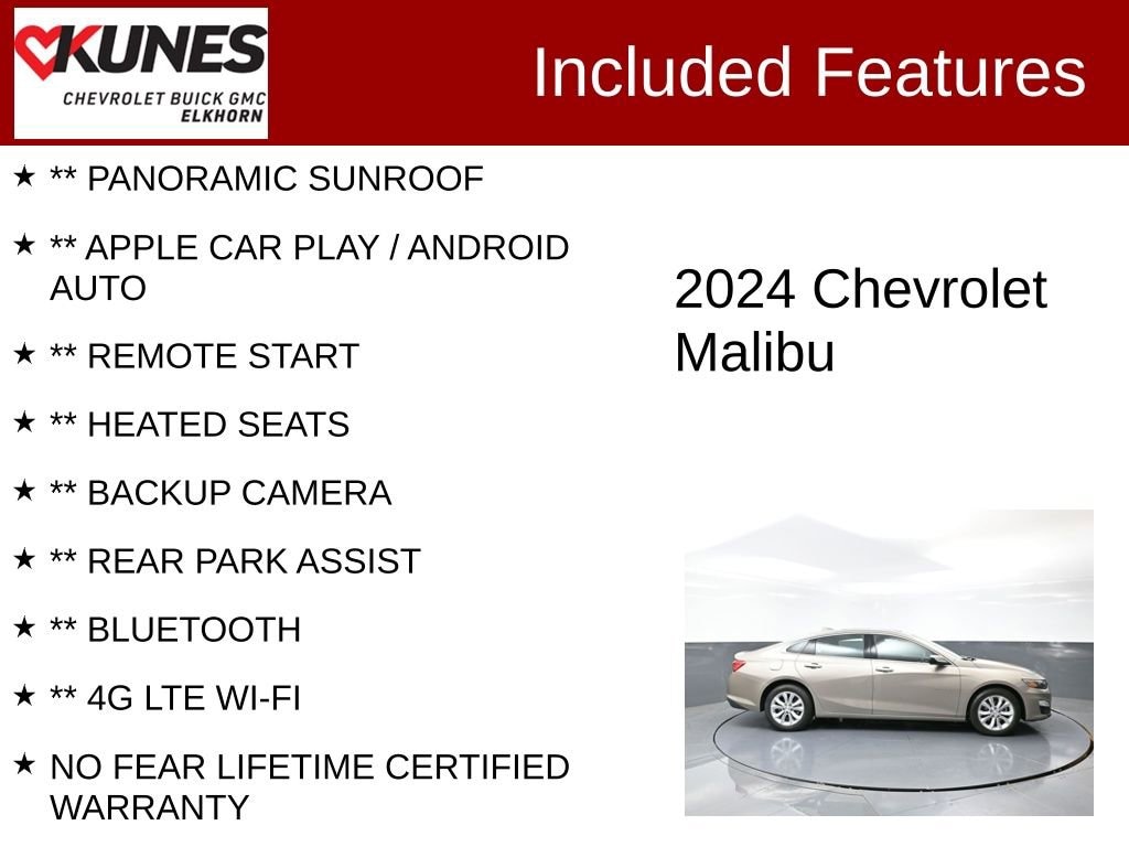 ** PANORAMIC SUNROOF, ** APPLE CAR PLAY / ANDROID AUTO, ** REMOTE START, ** HEATED SEATS, ** BACKUP CAMERA, ** REAR PARK ASSIST, ** BLUETOOTH, ** 4G LTE WI-FI, NO FEAR LIFETIME CERTIFIED WARRANTY, ONE OWNER, ACCIDENT FREE, LOCAL TRADE, Jet Black Cloth.Certified. Certification Program Details:** NO FEAR LIFETIME CERTIFIED PREOWNED **Over $2,895 of value at no cost!*LIFETIME WARRANTY!*3 Day Exchange Policy!*Complimentary powertrain warranty with ability to upgrade to fully comprehensive coverage and/or extend up to 125,000 miles!*125+ Point Inspection by our factory trained ASE Certified technicians and reconditioned to the highest standards.*Complimentary AutoCheck History Report*Complimentary AutoCheck Buyback Protection*Financing for Everyone - Guaranteed credit approval regardless of credit history!*Over 30 lenders who compete to get you the best financing terms*No payments for up to 90 days!*Weekly, Bi-Weekly, and Monthly Payment Options for all buyers!*First Free Oil Change!*Trade anytime policy - cars, trucks, boats, RVs, motorcycles - as long as we donât have to feed it, you can trade it!Priced below KBB Fair Purchase Price!2024 Chevrolet Malibu LT 1LT 1.5L DOHC CVT FWD Clean CARFAX. CARFAX One-Owner. Odometer is 1458 miles below market average! 28/36 City/Highway MPGFind out why our dealerships have won DealerRater.com DEALER OF THE YEAR a whopping 10 TIMES! Call, email, or live chat with one of our friendly sales professionals now to schedule your test drive! Prices shown do not include tax, title, registration and $499 service fees.