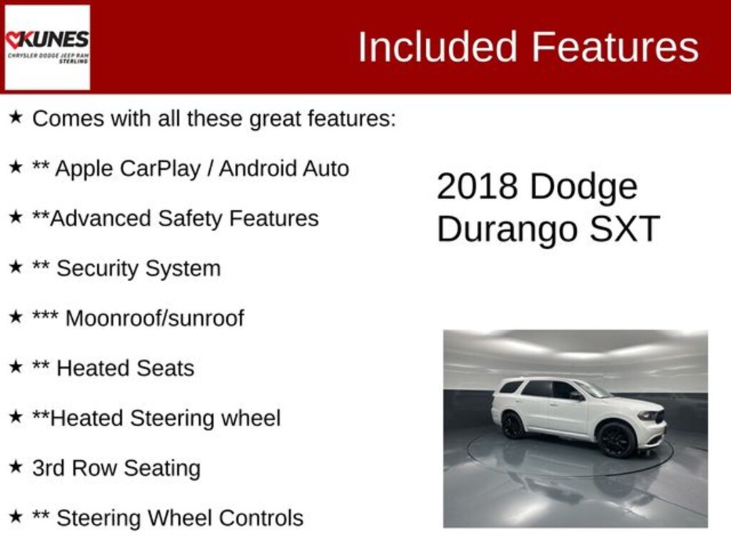 White Knuckle Clearcoat 2018 Dodge Durango SXT SXT Comes with all these great features:, ** Apple CarPlay / Android Auto, **Advanced Safety Features, ** Security System, *** Moonroof/sunroof, ** Heated Seats, **Heated Steering wheel, 3rd Row Seating, ** Steering Wheel Controls, ** Premium Wheels, ** Keyless Entry, ** Automatic Headlights, ** Bluetooth, ** Back up Camera, **Rear Park Assist, **SIRIUS XM, 180 Amp Alternator, 2nd Row 60/40 Fold & Tumble Seat, 7 & 4 Pin Wiring Harness, 7-Passenger Seating, Anti-whiplash front head restraints, Black Headlamp Bezels, Body Color Front Fascia, Body Color Rear Fascia, Body Color Shark Fin Antenna, Body Color Sill Molding, Body Color Wheel Lip Moldings, Compass, Delay-off headlights, Dual front impact airbags, Dual front side impact airbags, Dual Rear Exhaust w/Bright Tips, Emergency communication system: Roadside Assistance/9-1-1 Call, For More Info, Call 800-643-2112, Four wheel independent suspension, Front Bucket Seats, Front Center Armrest w/Storage, Gloss Black Badges, Gloss Black Exterior Mirrors, Gloss Black Grille, Heavy-Duty Engine Cooling, No Satellite Coverage HI/AK/PR/VI/GU, Overhead airbag, ParkSense Rear Park Assist w/Stop, Power 4-Way Driver Lumbar Adjust, Power 8-Way Driver/Manual Passenger Seat, Power door mirrors, Power Sunroof, Radio: Uconnect 4 w/7" Display, Rear Load Leveling Suspension, Rear seat center armrest, Speed control, Split folding rear seat, Spoiler, Wheels: 18" x 8.0" Painted Aluminum, Wheels: 20" x 8.0" Gloss Black Aluminum. Recent Arrival!
