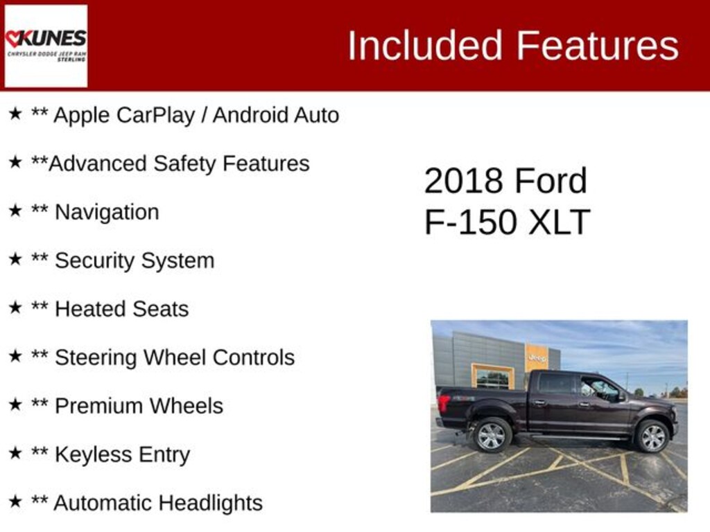 Magma Red 2018 Ford F-150 XLT XLT Comes with all these great features:, ** Apple CarPlay / Android Auto, **Advanced Safety Features, ** Navigation, ** Security System, ** Heated Seats, ** Steering Wheel Controls, ** Premium Wheels, ** Keyless Entry, ** Automatic Headlights, ** Bluetooth, ** Back up Camera, **Rear Park Assist, **SIRIUS XM, Remote Start. Recent Arrival!