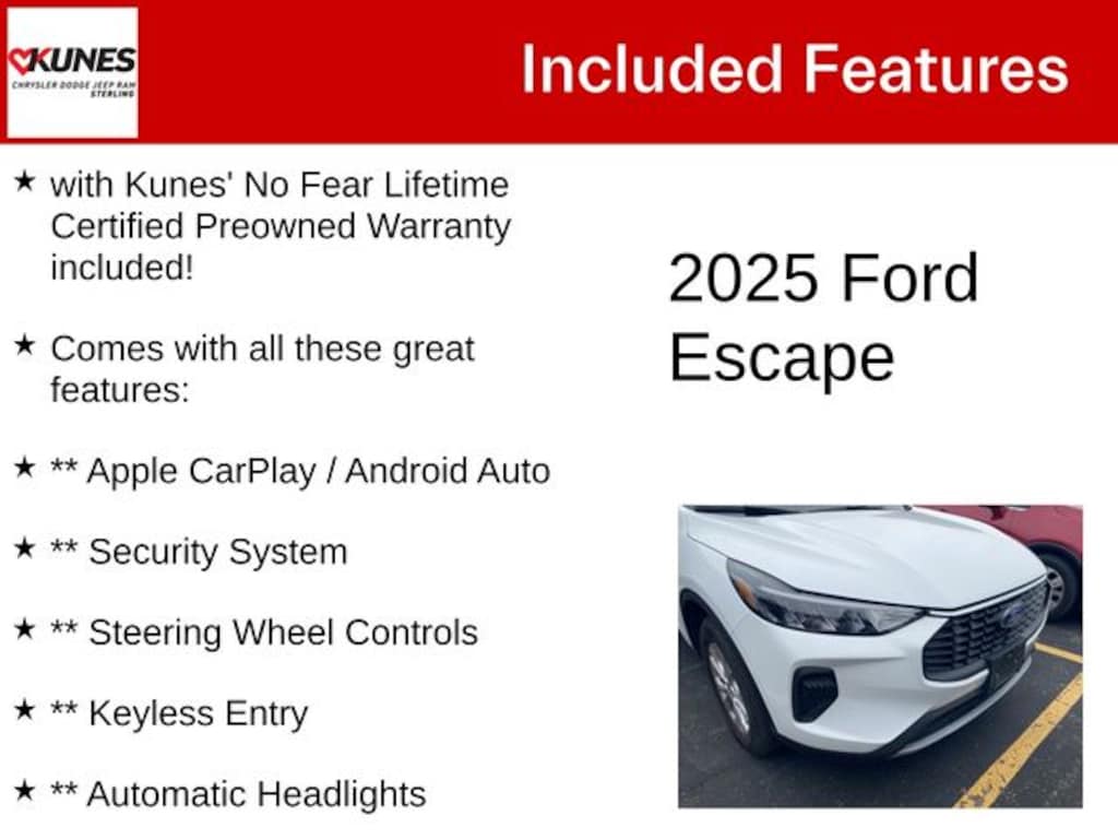 Oxford White 2025 Ford Escape Active Active with Kunes' No Fear Lifetime Certified Preowned Warranty included!, Comes with all these great features:, ** Apple CarPlay / Android Auto, ** Security System, ** Steering Wheel Controls, ** Keyless Entry, ** Automatic Headlights, ** Bluetooth, ** Back up Camera, **SIRIUS XM. Recent Arrival!