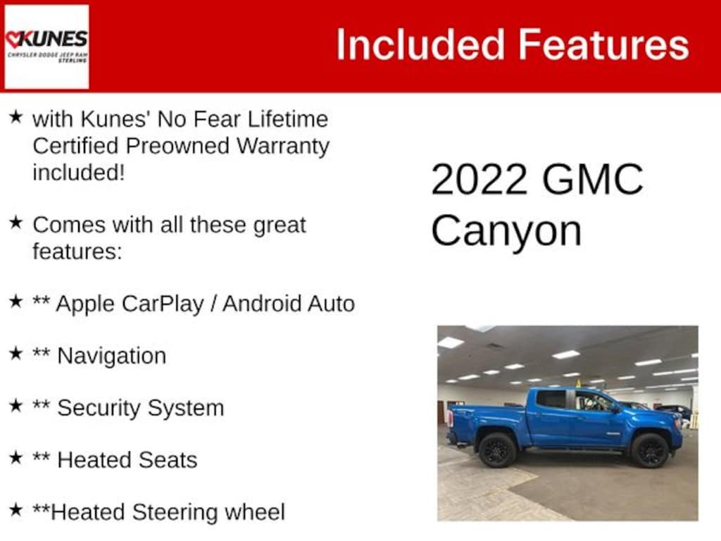Dynamic Blue Metallic 2022 GMC Canyon Elevation Elevation with Kunes' No Fear Lifetime Certified Preowned Warranty included!, Comes with all these great features:, ** Apple CarPlay / Android Auto, ** Navigation, ** Security System, ** Heated Seats, **Heated Steering wheel, ** Steering Wheel Controls, ** Keyless Entry, ** Automatic Headlights, ** Bluetooth, ** Back up Camera, **Rear Park Assist, **SIRIUS XM, Remote Start, Canyon Elevation, 4D Crew Cab, 4WD, Jet Black w/Cloth Seat Trim. Recent Arrival!