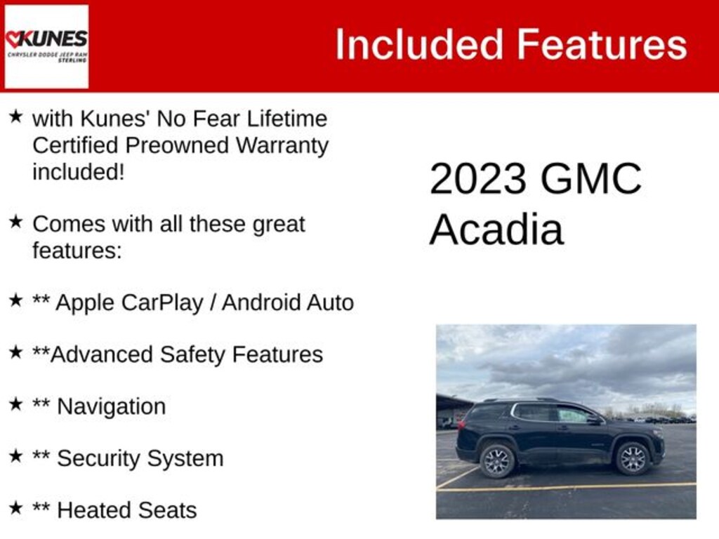 Black 2023 GMC Acadia SLT SLT with Kunes' No Fear Lifetime Certified Preowned Warranty included!, Comes with all these great features:, ** Apple CarPlay / Android Auto, **Advanced Safety Features, ** Navigation, ** Security System, ** Heated Seats, 2nd Row Captain Chairs, 3rd Row Seating, ** Steering Wheel Controls, ** Keyless Entry, ** Automatic Headlights, ** Bluetooth, ** Back up Camera, **Rear Park Assist, **SIRIUS XM, Remote Start, 3rd row seats: split-bench, 4-Way Manual Passenger Seat Adjuster, Bose Premium 8-Speaker Audio System Feature, Brake assist, Delay-off headlights, Emergency communication system: OnStar and GMC connected services capable, Front Center Armrest, Front reading lights, Navigation System, Overhead console, Passenger door bin, Preferred Equipment Group 4SA, Radio data system, Radio: AM/FM 8" Diagonal Multi-Touch Navigation, Rear reading lights, Rear window wiper, SiriusXM w/360L, Speed-sensing steering, Spoiler, Tachometer, Telescoping steering wheel, Tilt steering wheel, Voltmeter, Wireless Apple CarPlay/Wireless Android Auto. Recent Arrival!