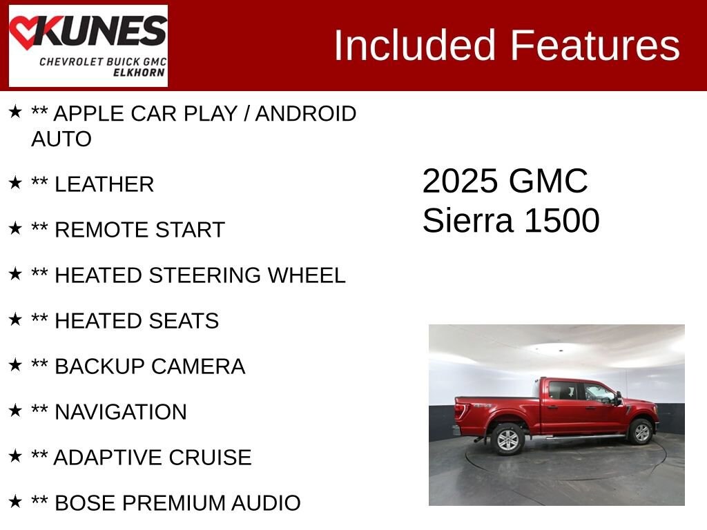 ** APPLE CAR PLAY / ANDROID AUTO, ** LEATHER, ** REMOTE START, ** HEATED STEERING WHEEL, ** HEATED SEATS, ** BACKUP CAMERA, ** NAVIGATION, ** ADAPTIVE CRUISE, ** BOSE PREMIUM AUDIO, ** SPRAY-ON BEDLINER, ** BLUETOOTH, ** 4G LTE WI-FI, LOCAL TRADE, ONE OWNER, 10-Speed Automatic, 4WD, Black Leather, 10-Way Power Driver Seat Adjuster w/Lumbar, 120-Volt Bed Mounted Power Outlet, 120-Volt Interior Power Outlet, 2 Charge/Data USB Ports, 2 Charge/Data USB Ports Inside Center Console, 2 Type-C Charge-Only Rear USB Ports, 4-Way Manual Passenger Seat Adjuster, 6 Speakers, 6-Speaker Audio System Feature, 6 Rectangular Black Tubular Assist Steps (LPO), Alloy wheels, AM/FM radio: SiriusXM with 360L, Apple CarPlay/Android Auto, Buckle to Drive, Cloth Seat Trim, Color-Keyed Carpeting Floor Covering, Compass, Deep-Tinted Glass, Delay-off headlights, Driver door bin, Driver vanity mirror, Electric Rear-Window Defogger, Electronic Precision Shift, Emergency communication system: OnStar, Floor-Mounted Center Console, Following Distance Indicator, Front 40/20/40 Split-Bench Seat, Front Bucket Seats, Front Center Armrest w/Storage, Front dual zone A/C, Front reading lights, Front wheel independent suspension, Fully automatic headlights, Genuine wood dashboard insert, Heated front seats, Illuminated entry, In-Vehicle Trailering System App, Integrated Trailer Brake Controller, IntelliBeam Automatic High Beam On/Off, Keyless Open & Start, LED Cargo Area Lighting, Low tire pressure warning, Manual Tilt-Wheel & Telescoping Steering Column, OnStar Services Capable, Outside temperature display, Overhead airbag, Overhead console, Passenger door bin, Passenger vanity mirror, Power Front Windows w/Driver Express Up/Down, Power Front Windows w/Passenger Express Down, Power Rear Windows w/Express Down, Power Sliding Rear Window w/Rear Defogger, Power windows, Push Button Start, Radio data system, Radio: Premium GMC Infotainment Audio System, Rear reading lights, Rear seat center armrest, Rear step bumper, Rear Wheelhouse Liners, Remote keyless entry, SiriusXM w/360L Trial Subscription, Speed control, Speed-sensing steering, Split folding rear seat, Spray-On Pickup Bedliner w/GMC Logo, Steering Wheel Audio Controls, Steering wheel mounted audio controls, Telescoping steering wheel, Tilt steering wheel, Trailer Side Blind Zone Alert, Trip computer, Variably intermittent wipers, Voltmeter, Wheels: 20 x 9 High Gloss Black Painted Aluminum, Wi-Fi Hotspot Capable, Wireless Charging.Certified. Certification Program Details:** NO FEAR LIFETIME CERTIFIED PREOWNED **Over $2,895 of value at no cost!*LIFETIME WARRANTY!*3 Day Exchange Policy!*Complimentary powertrain warranty with ability to upgrade to fully comprehensive coverage and/or extend up to 125,000 miles!*125+ Point Inspection by our factory trained ASE Certified technicians and reconditioned to the highest standards.*Complimentary AutoCheck History Report*Complimentary AutoCheck Buyback Protection*Financing for Everyone - Guaranteed credit approval regardless of credit history!*Over 30 lenders who compete to get you the best financing terms*No payments for up to 90 days!*Weekly, Bi-Weekly, and Monthly Payment Options for all buyers!*First Free Oil Change!*Trade anytime policy - cars, trucks, boats, RVs, motorcycles - as long as we donât have to feed it, you can trade it!2025 GMC Sierra 1500 Elevation EcoTec3 5.3L V8 10-Speed Automatic 4WD Clean CARFAX. CARFAX One-Owner.Find out why our dealerships have won DealerRater.com DEALER OF THE YEAR a whopping 10 TIMES! Call, email, or live chat with one of our friendly sales professionals now to schedule your test drive! Ask about some of our other Chevrolet, GMC, Buick, Ford, Chrysler, Dodge, Jeep, Ram, Tesla, Kia, Hyundai, INFINITI, BMW, Mercedes, Toyota, Lexus, Nissan, Volkswagen, Hummer, Lincoln, Mazda, Mitsubishi, Honda, Acura, and other vehicles that may have navigation,