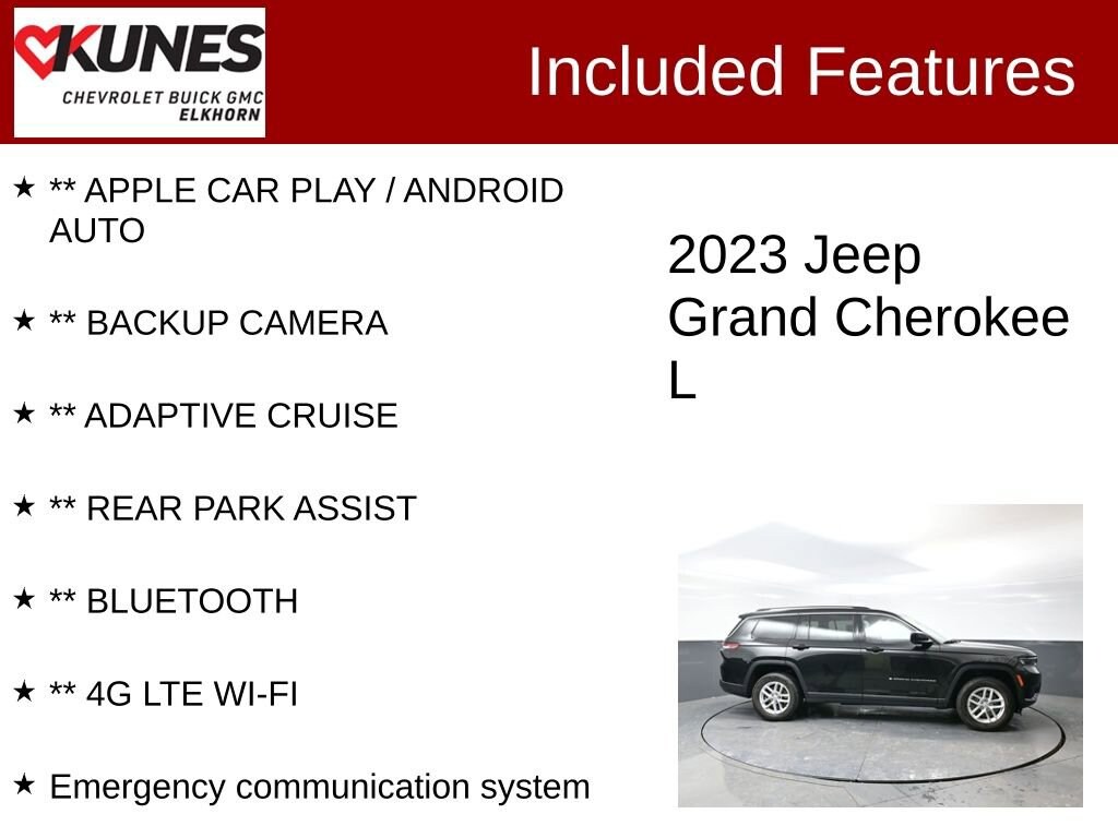 2023 Jeep Grand Cherokee L Laredo Diamond Black Crystal Pearlcoat 4WD 3.6L V6 24V VVTRecent Arrival! CARFAX One Owner. Diamond Black Crystal Pearlcoat exterior Adaptive cruise control Blind spot monitor Rear parking aid with backup camera 3.6L V6 engine with 8-speed automatic transmission Automatic full-time four-wheel drive Heated mirrors Lane departure warning and lane keep assist Front collision mitigation Driver adjustable lumbar, power driver seat Multi-zone climate control and rear air conditioning Aluminum wheels Keyless entry and push-button start Bluetooth connection and smart device integration WiFi hotspot capability Rear defrost and privacy glass Adjustable steering wheel and bucket seats Child safety locks and advanced airbag system 6-speaker AM/FM audio system with auxiliary input USB power outlets and steering wheel audio controls 7-passenger seating with 3rd row seat Telematics and trip computer