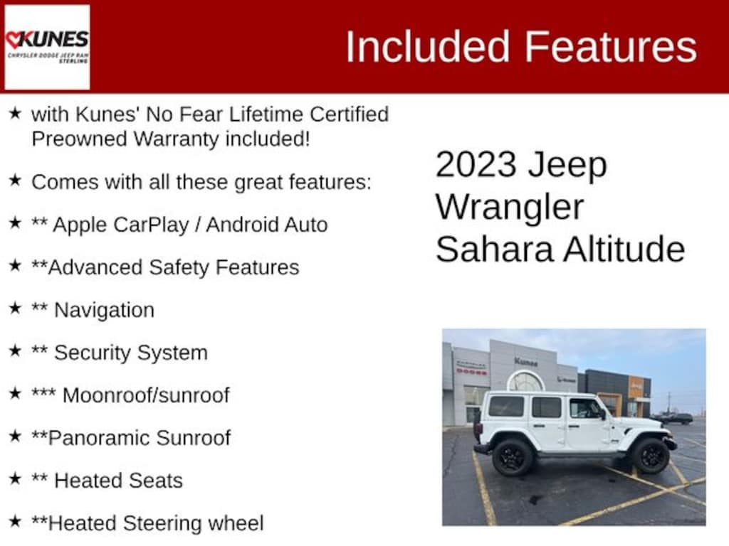 Bright White Clearcoat 2023 Jeep Wrangler Altitude Altitude with Kunes' No Fear Lifetime Certified Preowned Warranty included!, Comes with all these great features:, ** Apple CarPlay / Android Auto, **Advanced Safety Features, ** Navigation, ** Security System, *** Moonroof/sunroof, **Panoramic Sunroof, ** Heated Seats, **Heated Steering wheel, ** Steering Wheel Controls, ** Premium Wheels, ** Keyless Entry, ** Automatic Headlights, ** Bluetooth, ** Back up Camera, **SIRIUS XM, Remote Start, #1 Seat Foam Cushion, 110 MPH Vehicle Max Speed Calibration, 3.45 Overall Top Gear Ratio, 9 Speakers, Altitude Package, Auto High Beam Headlamp Control, Aux Battery, Black Interior Accents, Body Color Grille w/Gloss Black Rings, Bridgestone Brand Tires, Cloth Low-Back Bucket Seats, Compass, Delay-off headlights, Driver door bin, Driver vanity mirror, Emergency communication system: SiriusXM Guardian, Front anti-roll bar, Front Bucket Seats, Front Center Armrest w/Storage, Front reading lights, Full Speed Forward Collision Warning Plus, Gray/Black Trail Rated Badge, Heated Front Seats, Heavy Duty Suspension w/Gas Shocks, Illuminated entry, Integrated roll-over protection, Leather Trimmed Bucket Seats (GL), Leather Wrapped Park Brake Handle, Leather Wrapped Shift Knob, LED Taillamps, Matte Black Jeep Badge, Mold In Color Bumper w/Gloss Black, MOPAR Hardtop Headliner, Non-Lock Fuel Cap w/o Discriminator, Occupant sensing airbag, Outside temperature display, Passenger door bin, Passenger vanity mirror, Power door mirrors, Radio data system, Radio: Uconnect 4C Nav w/8.4" Display, Rear anti-roll bar, Rear reading lights, Remote Start System, Side Steps, Sky 1-Touch Power Top, Split folding rear seat, Stop-Start Dual Battery System, Telescoping steering wheel, Variably intermittent wipers, Voltmeter, Wheels: 18" x 7.5" Gloss Black Aluminum, Wheels: 18" x 7.5" Machined w/Gray Spokes, Wizard Black Instrument Panel Bezels.