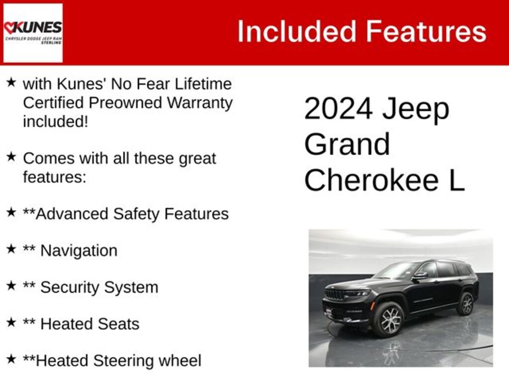 Diamond Black Crystal Pearlcoat 2024 Jeep Grand Cherokee L Limited Limited with Kunes' No Fear Lifetime Certified Preowned Warranty included!, Comes with all these great features:, **Advanced Safety Features, ** Navigation, ** Security System, ** Heated Seats, **Heated Steering wheel, 3rd Row Seating, ** Steering Wheel Controls, ** Keyless Entry, ** Automatic Headlights, ** Bluetooth, ** Back up Camera, **SIRIUS XM, Remote Start, 2nd Row Manual Window Shades, Auto-Dimming Exterior Driver Mirror, Capri Leatherette w/Axis II Seats, Heated rear seats, Integrated Off-Road Camera, Interior Rear Facing Camera, Intersection Collision Assist System, Luxury Tech Group II, Memory Steering Column, Navigation System, ParkSense Front/Rear Park Assist w/Stop, Passive Entry - Front/Rear Doors, Liftgate, Power Tilt/Telescope Steering Column, Quick Order Package 23E, Rain Sensitive Windshield Wipers, Rear Back Up Camera Washer, Rearview Autodim Digital Display Mirror, Surround View Camera System, Ventilated Front Seats, Wireless Charging Pad. Recent Arrival!