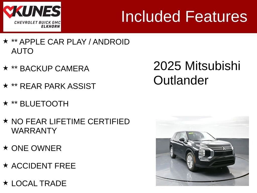 ** APPLE CAR PLAY / ANDROID AUTO, ** BACKUP CAMERA, ** REAR PARK ASSIST, ** BLUETOOTH, NO FEAR LIFETIME CERTIFIED WARRANTY, ONE OWNER, ACCIDENT FREE, LOCAL TRADE.Certified. Certification Program Details:** NO FEAR LIFETIME CERTIFIED PREOWNED **Over $2,895 of value at no cost!*LIFETIME WARRANTY!*3 Day Exchange Policy!*Complimentary powertrain warranty with ability to upgrade to fully comprehensive coverage and/or extend up to 125,000 miles!*125+ Point Inspection by our factory trained ASE Certified technicians and reconditioned to the highest standards.*Complimentary AutoCheck History Report*Complimentary AutoCheck Buyback Protection*Financing for Everyone - Guaranteed credit approval regardless of credit history!*Over 30 lenders who compete to get you the best financing terms*No payments for up to 90 days!*Weekly, Bi-Weekly, and Monthly Payment Options for all buyers!*First Free Oil Change!*Trade anytime policy - cars, trucks, boats, RVs, motorcycles - as long as we donât have to feed it, you can trade it!Priced below KBB Fair Purchase Price!2025 Mitsubishi Outlander ES 2.5L I4 DOHC 16V LEV3-SULEV30 181hp CVT FWD Clean CARFAX. CARFAX One-Owner. 24/31 City/Highway MPGFind out why our dealerships have won DealerRater.com DEALER OF THE YEAR a whopping 10 TIMES! Call, email, or live chat with one of our friendly sales professionals now to schedule your test drive! Ask about some of our other Chevrolet, GMC, Buick, Ford, Chrysler, Dodge, Jeep, Ram, Tesla, Kia, Hyundai, INFINITI, BMW, Mercedes, Toyota, Lexus, Nissan, Volkswagen, Hummer, Lincoln, Mazda, Mitsubishi, Honda, Acura, and other vehicles that may have navigation, sunroof, adaptive cruise control, leather, cooled seats, blind spot monitor, lane keep assist, panoramic moonroof, tow hitch, Bose audio, Harman Kardon, Sony, remote start, AWD, all wheel drive, 4x4, wireless charging, sirius XM, heated seats, heated steering wheel, V8, diesel, chrome, bed-liner, luggage rack, sensing, power folding mirrors, 5th wheel, gooseneck, autopilot, self-driving, EV, remote locking tailgate, LT, LTZ, High Country, LX, EX, EX-L, DVD, rear entertainment, rear bucket seats, S, SV, SL, premium, black edition, soft top, hard top, convertible, rally stripes, GT, Shelby, Z71, XL, XLT, Lariat, Denali, SLT, SLE, RS, Rebel, Preferred, Premier, Essence, Limited, Luxury, and more. Prices shown do not include tax, title, registration and $499 service fees.