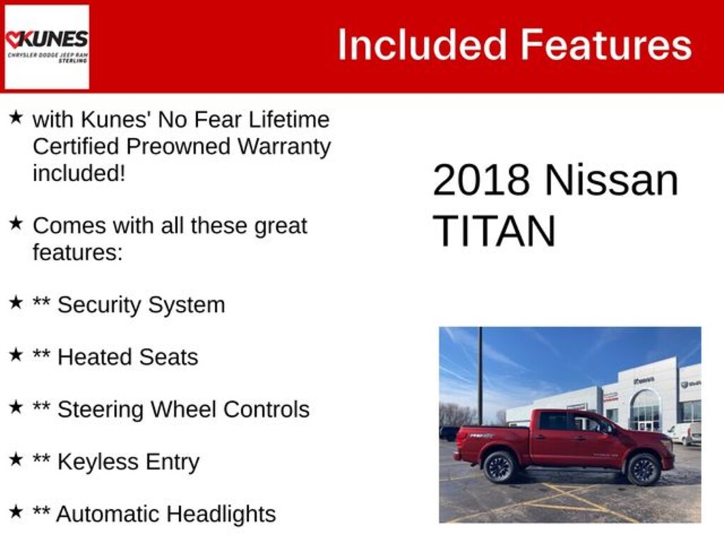 Red 2018 Nissan Titan PRO-4X PRO-4X with Kunes' No Fear Lifetime Certified Preowned Warranty included!, Comes with all these great features:, ** Security System, ** Heated Seats, ** Steering Wheel Controls, ** Keyless Entry, ** Automatic Headlights, ** Bluetooth, ** Back up Camera, Remote Start, ABS brakes, Alloy wheels, Electronic Stability Control, Front dual zone A/C, Heated door mirrors, Illuminated entry, Low tire pressure warning, Navigation System, Remote keyless entry, Traction control.