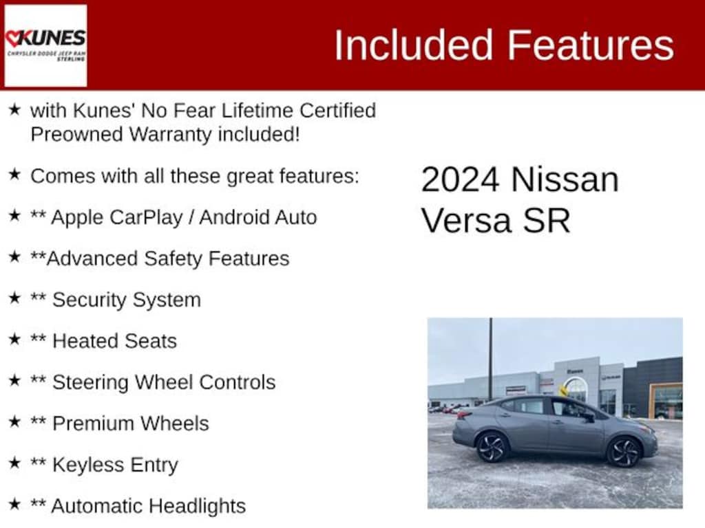 Gun Metallic 2024 Nissan Versa 1.6 SR 1.6 SR with Kunes' No Fear Lifetime Certified Preowned Warranty included!, Comes with all these great features:, ** Apple CarPlay / Android Auto, **Advanced Safety Features, ** Security System, ** Heated Seats, ** Steering Wheel Controls, ** Premium Wheels, ** Keyless Entry, ** Automatic Headlights, ** Bluetooth, ** Back up Camera, **Rear Park Assist, **SIRIUS XM, Remote Start, Rear Parking Sensors.