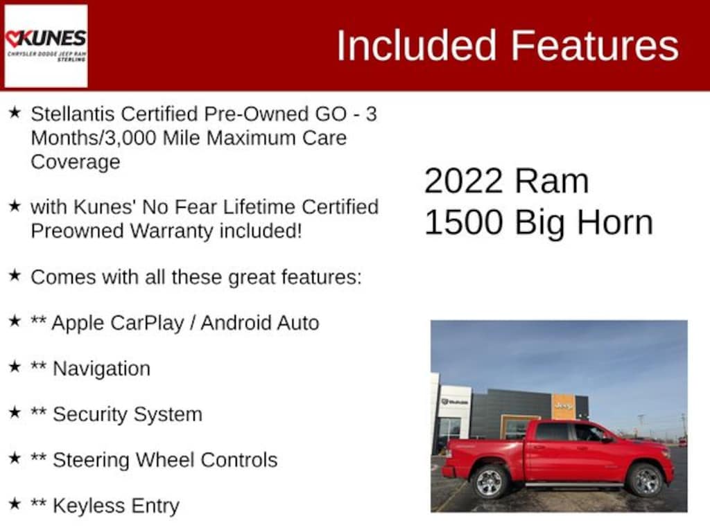 Flame Red Clearcoat 2022 Ram 1500 Big Horn/Lone Star Big Horn/Lone Star Stellantis Certified Pre-Owned GO - 3 Months/3,000 Mile Maximum Care Coverage, with Kunes' No Fear Lifetime Certified Preowned Warranty included!, Comes with all these great features:, ** Apple CarPlay / Android Auto, ** Navigation, ** Security System, ** Steering Wheel Controls, ** Keyless Entry, ** Automatic Headlights, ** Bluetooth, ** Back up Camera, **SIRIUS XM, Remote Start, 2nd Row In Floor Storage Bins, 3 Rear Seat Head Restraints, 4G LTE Wi-Fi Hot Spot, 8.4" Touchscreen Display, All Plant-Installed Decals, All R1 High Radios, All Radio Equipped Vehicles, Alloy wheels, Apple CarPlay, Auto-Dimming Exterior Driver Mirror, Auto-Dimming Rear-View Mirror, Big Horn Badge, Black Interior Accents, Black Premium Power Mirrors, Body Color Exterior Mirrors, Body Color Front Bumper, Body Color Premium Power Mirrors, Body Color Rear Bumper w/Step Pads, Bridgestone Brand Tires, Cluster 3.5" TFT Color Display, Compass, Convex Wide-Angle Mirror Insert, Delete LED Lamp - Floor Console Bin, Deluxe Cloth Bucket Seats, Driver door bin, Exterior Mirrors w/Heating Element, Exterior Mirrors w/Supplemental Signals, For Details, Visit DriveUconnect.com, Front Center Armrest w/Storage, Glove Box Lamp, Google Android Auto, GPS Antenna Input, GPS Navigation, HD Radio, Heated door mirrors, Illuminated entry, Integrated Center Stack Radio, Occupant sensing airbag, Outside temperature display, Overhead console, Panic alarm, Passenger door bin, Power 8-Way Driver Seat, Power Adjustable Pedals, Power-Folding Mirrors, Radio data system, Radio: Uconnect 3 w/5" Display, Radio: Uconnect 5 Nav w/8.4" Display, Radio: Uconnect 5 W w/8.4" Display, Rear 60/40 Folding Seat, Rear anti-roll bar, Rear Dome w/On/Off Switch Lamp, Rear Power Sliding Window, Rear seat center armrest, Rear step bumper, Rear Window Defroster, Remote keyless entry, SiriusXM Radio Service, Speed control, Split folding rear seat, Sport Decal, Sun Visors w/Illuminated Vanity Mirrors, Tachometer, Telescoping steering wheel, Tilt steering wheel, Voltmeter, Wheels: 20" x 9" Aluminum Chrome Clad (WRK).