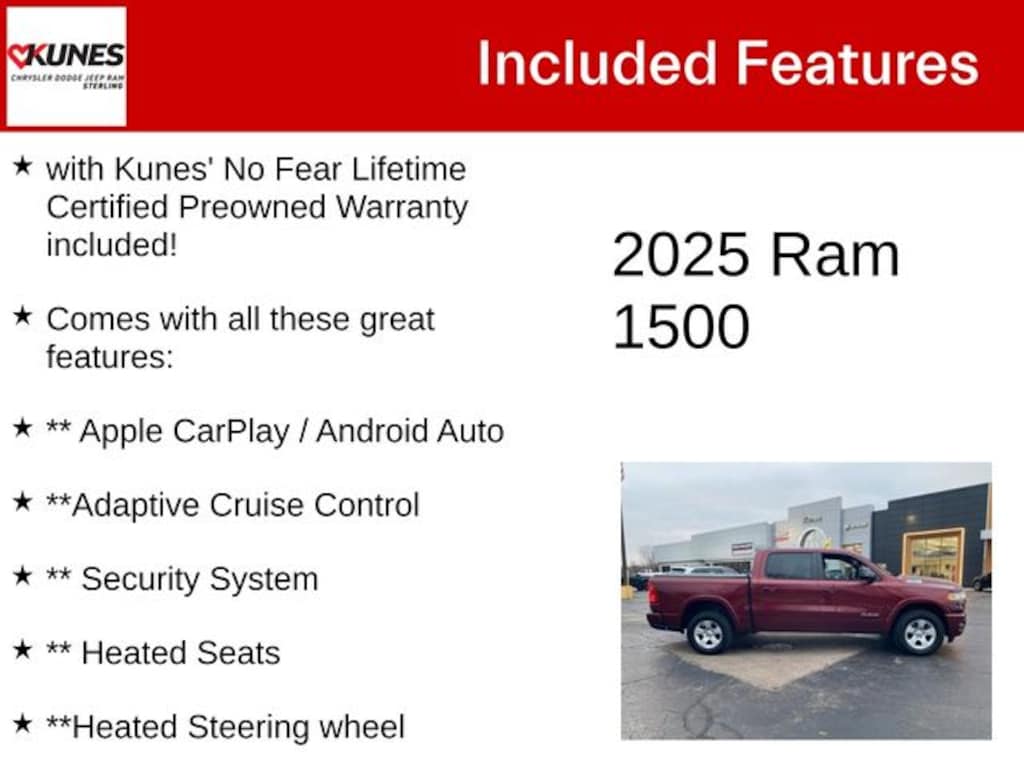Delmonico Red Pearlcoat 2025 Ram 1500 Big Horn/Lone Star Big Horn/Lone Star with Kunes' No Fear Lifetime Certified Preowned Warranty included!, Comes with all these great features:, ** Apple CarPlay / Android Auto, **Adaptive Cruise Control, ** Security System, ** Heated Seats, **Heated Steering wheel, ** Steering Wheel Controls, ** Premium Wheels, ** Keyless Entry, ** Automatic Headlights, ** Bluetooth, ** Back up Camera, **Rear Park Assist, **SIRIUS XM, Remote Start, 115V Auxiliary Power Outlet, 2nd Row In Floor Storage Bins, 4 Way Front Headrests, 400W Inverter, Auto Power-Folding Mirrors, Auto-Dimming Exterior Driver Mirror, Auto-Dimming Rear-View Mirror, Black Exterior Mirrors, Black Interior Accents, Black Premium Power Mirrors, Body Color Door Handles, Body Color Front Bumper, Body Color Rear Bumper w/Step Pads, Body Color Tailgate Handle, Bucket Seats, Bumpers: chrome, Convex Wide-Angle Exterior Mirror Insert, Driver door bin, Exterior Mirrors Courtesy Lamps, Front Center Armrest w/Storage, Front reading lights, Front Seat Back Map Pockets, Front wheel independent suspension, Full Length Floor Console, Fully automatic headlights, Glove Box Lamp, GPS Antenna Input, Grille Surround 1 Body Color Texture 1 Black, Illuminated entry, Low tire pressure warning, Manual Adjust 4-Way Front Passenger Seat, Manual Folding Exterior Mirrors, MOPAR Front & Rear Rubber Floor Mats, Occupant sensing airbag, Outside temperature display, Overhead airbag, Overhead console, Panic alarm, Passenger door bin, Radio: Uconnect 5 W w/8.4" Display, Rear anti-roll bar, Rear Center Armrest, Rear Power Sliding Window, Rear step bumper, Rear Window Defroster, Steering Wheel Mounted Audio Controls, Sun Visors w/Illuminated Vanity Mirrors, Supplier Part Tracking (J-1), Telescoping steering wheel, Tilt steering wheel, Voltmeter.